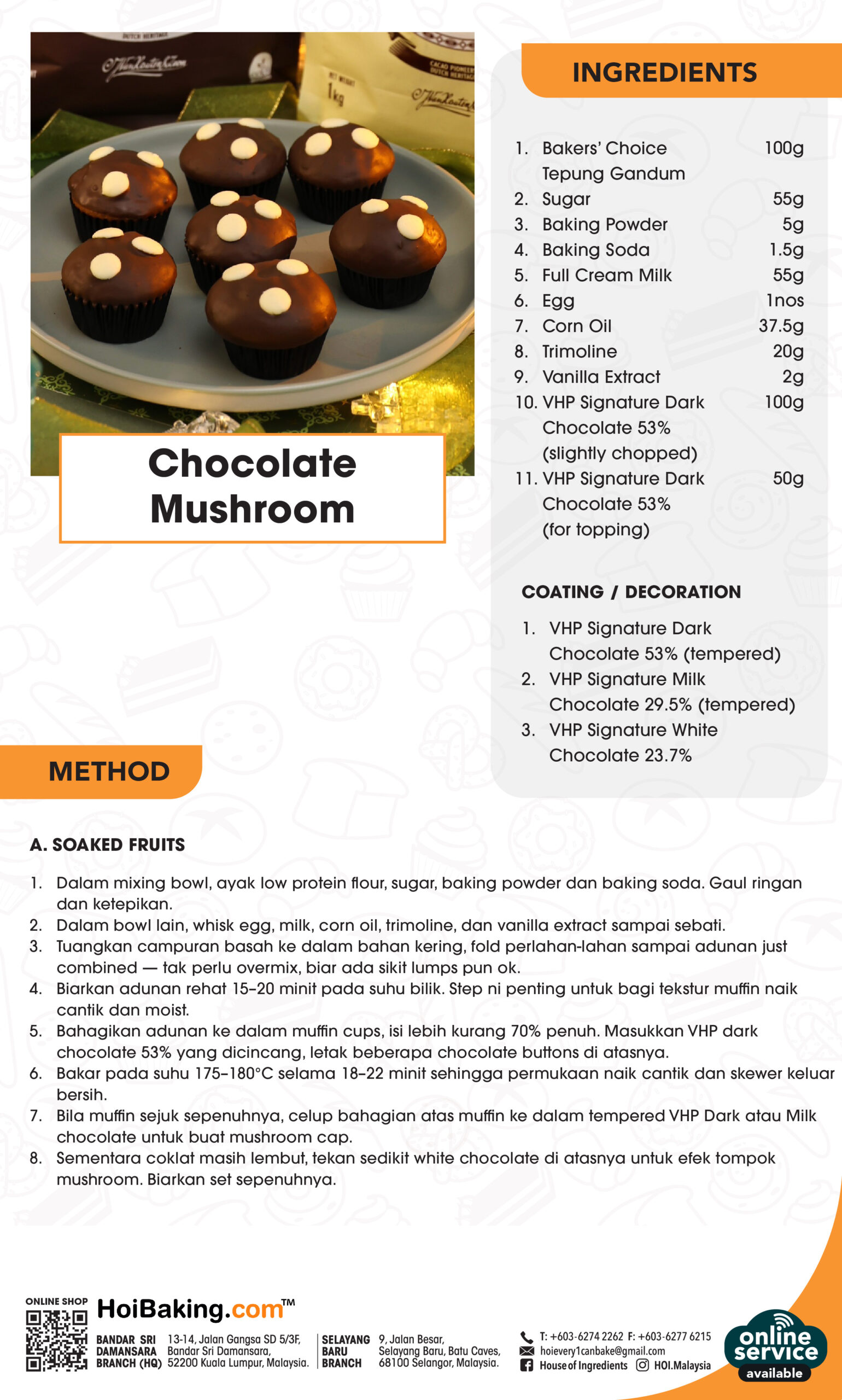 7. Bila muffin sejuk sepenuhnya, celup bahagian atas muffin ke dalam tempered VHP Dark atau Milk chocolate untuk buat mushroom cap.